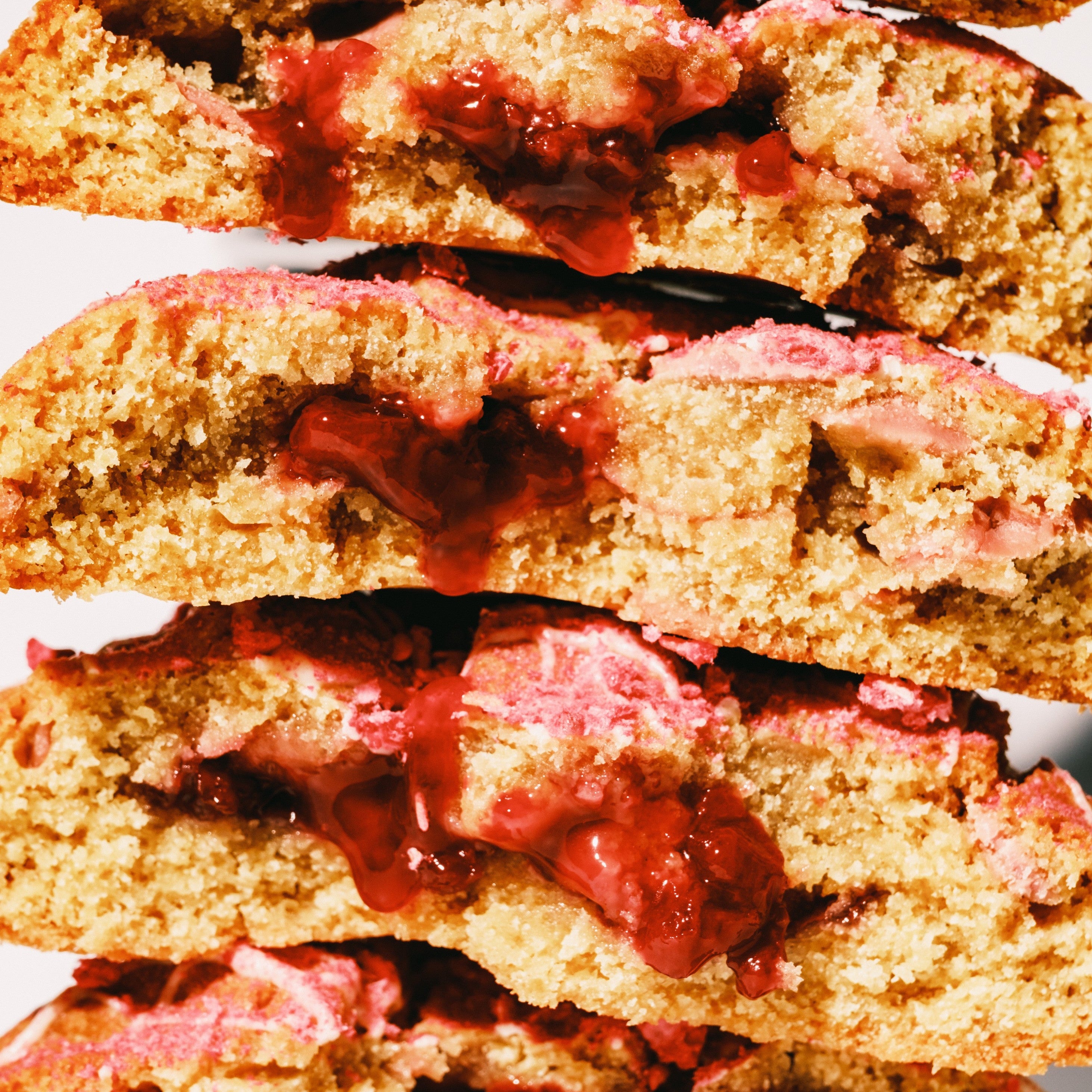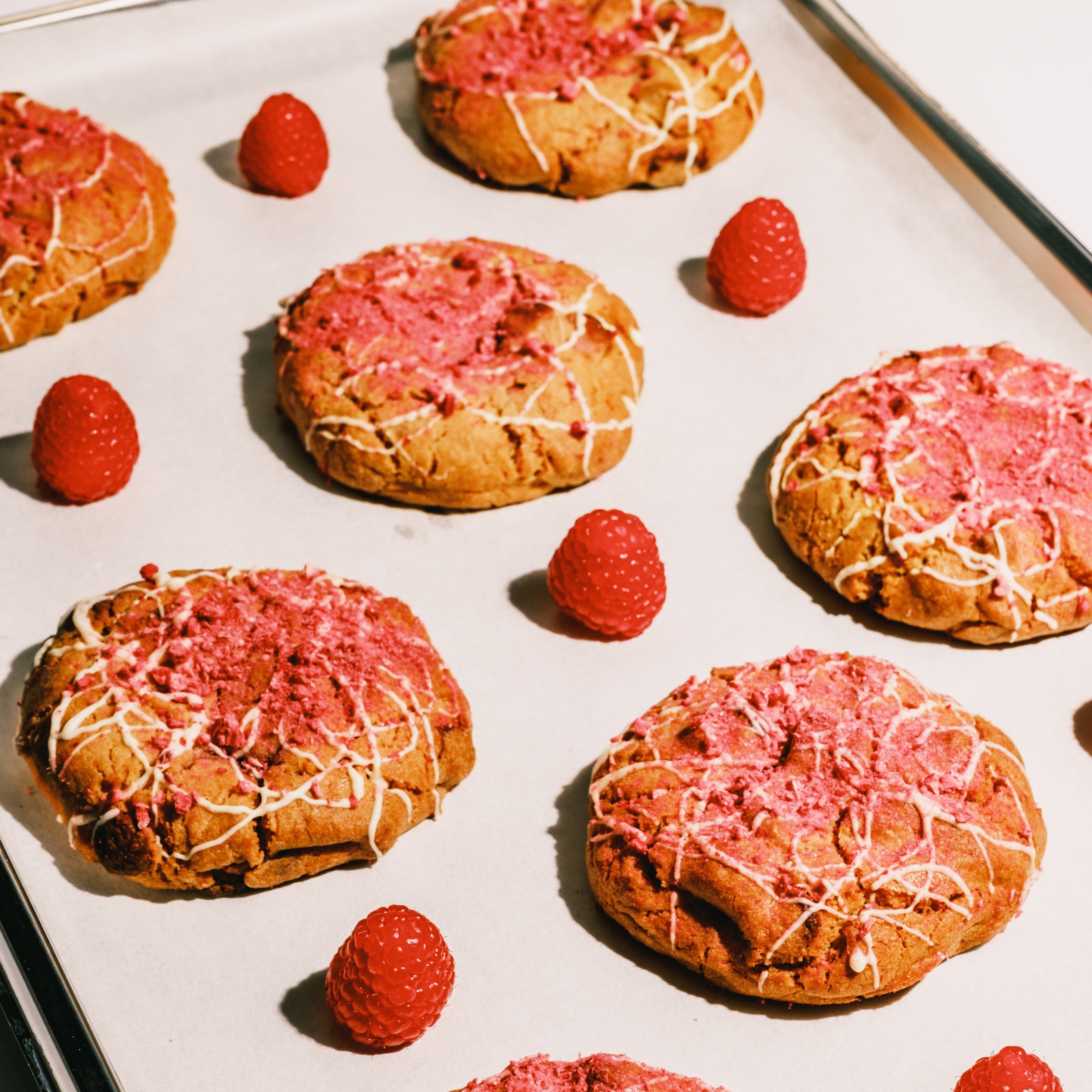 Our Ruby Chocolate & Raspberry cookie starts with a vanilla dough packed with Belgian ruby chocolate chips, filled with a vibrant raspberry jam centre, and finished with silky white chocolate swirls and a scatter of dried raspberry pieces for that perfect sweet-tart crunch.